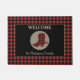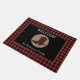 Uma bota de cowboy de xadrez de búfalo está no centro de um círculo bronzeado neste tapete de porta atraente. O círculo é colocado sobre um fundo preto, que é enquadrado com uma borda de xadrez de búfalos vermelha e preta correspondente. Seu texto personalizado está em um tom correspondente acima e abaixo do círculo e da imagem de inicialização. Perfeito para uma cabana, ou casa no campo, mas confortável em casa na cidade também!