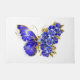 Borboleta de flores cinza, azul, safira, espumante com asa decorada com flores preciosos azuis com folhas de ouro sobre fundo branco.