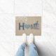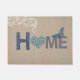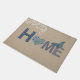 As letras dos retalhos com período floral azul e branco do coração para fora dirigem neste design bonito do estilo country em um fundo rústico de linho do efeito de serapilheira. Detalhes adicionados de uma borboleta azul e de um teste padrão floral branco do rolo. Projetado pelo design da cotovia