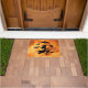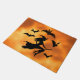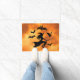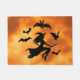 As bruxas e morcegos se enrolam contra fundo amarelo e laranja.