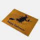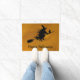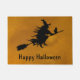 Um divertimento e uma esteira de porta assustador para o Dia das Bruxas, bruxas e amantes do gato! Projetado com uma silhueta preta detalhada de uma bruxa em vôo em sua vassoura. Naturalmente seu gato preto de boa sorte senta-se na vassoura na frente da bruxa, apronta-se por uma noite do divertimento! A pia batismal assustador preta do Dia das Bruxas e o desejo "o Dia das Bruxas feliz" do Dia das Bruxas são ajustados abaixo da silhueta preta. O fundo é laranja mottled para imitar uma Lua cheia bewitching. Uma maneira deliciosa de vestir acima sua entrada para a estação do Dia das Bruxas!