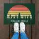 Porta legal da cabana de tronco em verde florestal para um acampamento ou casa de floresta. Esta decoração caseira personalizada apresenta um belo pôr do sol vintage sobre uma floresta de árvores bonito sob seu texto personalizado.