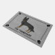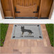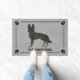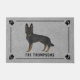 A ilustração original do desenho animado de Destei de um cão preto da raça German shepherd bi-color. A cor de fundo é cinza com textura decorativa. A textura pode ser removida e a cor de fundo pode ser alterada para qualquer outra cor, se desejado. O design é enquadrado por uma fronteira na moda. Há uma silhueta de impressão de pata de cachorro em cada esquina também. Sob a imagem do cão há um texto personalizável que é para um nome de família ou outro texto personalizado, como "bem-vindo", por exemplo.