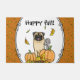 Cachorro Queda - Cachorro Pug bonito cercado por folhas do outono, abóboras, pinheiros cones, e um amigo esquilo feliz segurando uma bolota. Copyright © Angi Laframboise. Brincadeiras de desenho animado, sazonais e de férias, para amantes de cães.
