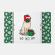 Feliz Natal Papai Noel - Engraçado, sorridente cão Pug vestindo um chapéu de Papai Noel e sentado com um presente de Natal com arco e sinos. HO HO HO! Copyright © Angi Laframboise. Cachorros de Natal bonitos criam presentes de desenho animado para amantes de cães.
