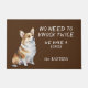 "Não precisamos bater duas vezes, temos um Corgi" declara este tapete engraçado da porta. O texto está branco no lado direito, enquanto uma imagem de um adorável Corgi está à esquerda. Tudo é colocado sobre um fundo castanho escuro.