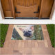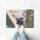 Um filhote francês de oito semanas, uma fêmea colorida, olha curiosamente através de um galho coberto de musgo de uma árvore. Este tapete de porta é uma ideia encantadora de presente para amantes de cachorro e Bulldog Francês. Um popular cão companheiro fotografado por Katho Menden.
