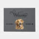 Este tapete de porta com Golden Retriever é o presente perfeito para qualquer amante de cães. Este design é completo com as palavras "Bem-vindo à nossa casa", um local para adicionar seu nome e o nome do seu cão, e uma adorável ilustração de Golden Retriever em aquarela. Aproveite!