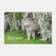 Um filhote de Malamute, jovem no Alaska, com um casaco duplo de pelúcia, parado em um campo de grama com um arbusto branco florescente em primavera. Foto de cachorro fofo tirada por Katho Menden, esta porta é uma ideia de presente para amantes de cachorros e animais de estimação.