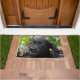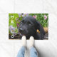 Um cachorrinho preto Labrador Retriever, um retrato engraçado num jardim. Foto de um cão jovem, de olhos de cachorrinho, tirada por Katho Menden. Este tapete de porta HELLO é uma ideia de presente para amantes de animais de estimação e cães.