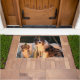 Design apresenta uma fotografia humorística de cães vestidos para comemorar a véspera de Ano Novo. Eles estão sentados em um cobertor furado e estão vestindo chapéus de festa. Uma garrafa de champanhe está aberta na frente deles.