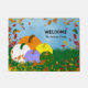 Imagem de uma cena do outono, com folhas caindo em abóboras.
