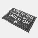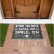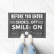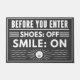 Calçados, sorria! Essa porta combina funcionalidade com estilo: uma mensagem clara para pisos limpos, embalada em um design moderno com um toque de humor. O estilo de fonte minimalista é complementado por um sol alegre que adiciona calor e positividade. Perfeito para qualquer entrada e personalizável para combinar com as cores de sua casa, este tapete manterá você e seus convidados arrumados e de bom humor - ou como presente para amigos e famílias.