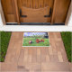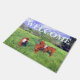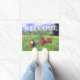 Este tapete tem um grupo de adoráveis primavera vitelos e a palavra bem-vindos no topo perfeito para o amante das vacas ou para o degrau da porta dos agricultores.