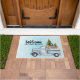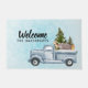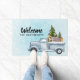 Bem-vinda à porta com um design de férias festivo. Um caminhão carregando pinheiros de Natal junto com alguns animais da floresta. Um urso, uma raposa e um veado nas costas, indo dar uma volta. Design criado com aquarelas.