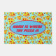 Uma porta azul-aqua colorida e de moenda impressa em todas as partes com fatias de pizza de pepperoni, com a frase HOME IS ONDE ESTÁ O PIZZA. Perfeito para pizzarias, chefs de pizza e decoração de pizzaria