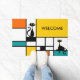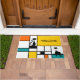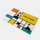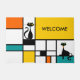 Bem-vindos a um tapete com meios séculos negros icônicos em um passado de arte moderna. Grelha de estilo Mondrian laranja, amarelo e lacrimogêneo.