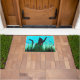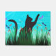 A black cat silhouette with dragonflies and cattail plants on a blue & green background.