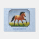 Cavalo de pele selvagem galopando através de uma planície pastosa. Acentuado com um bonito fundo azul-céu com padrão.