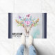 Portão personalizado de boas-vindas com um fundo de turquesa e de aquarela pastel. Um crânio bicho-papão com um buquê floral sobre sua cabeça e pequenas borboletas se espalhando.