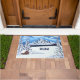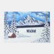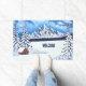 Uma porta com uma bela cena de inverno, incluindo montanhas cobertas de neve, evergreens e cabana rustica. O texto pode ser personalizado ou excluído. Arte original por W.B.