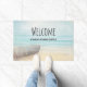 Uma porta de boas-vindas com uma bela imagem rústica. Cores sutis de azul claro, marrom arenoso e branco suave. Uma cena de praia com um barco na praia com uma rede de pesca pendurada ao lado. Um olhar elegante.