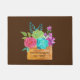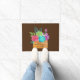 Uma bela arranjo floral rosa azul roxo verde em uma cesta sobre este tapete de porta. Personalize com seu nome e o ano em que você se casou.