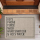 Este divertido design de tapete de porta apresenta as palavras "Chaves, Telefone, Bolsa, Máscara, Desinfetante para as mãos, Água Benta". Personalize este lindo tapete de porta de juta falso rústico com seus próprios lembretes personalizados para sair de casa. O presente perfeito único para aquecimento de casa moderno ou novos proprietários.
