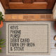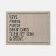 Este design engraçado de tapete de porta apresenta as palavras "Chaves, Telefone, Bolsa, Cartão de Débito, Desligue o Ferro e o Fogão". Personalize este lindo tapete de porta rústico de burlap falso com seus próprios lembretes personalizados para sair de casa. O presente perfeito e único para aquecimento do lar ou novos proprietários.