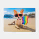 Esta foto fofa mostra um cachorro chihuahua na praia carregando uma bandeira Orgulho gay de cor arco-íris.