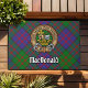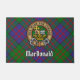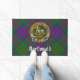 Crachá da crista Clan MacDonald rodeado por uma correia e fivela sobre fundo tartano. Texto personalizado.