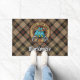 Crachá da crista Clan MacKenzie cercado por uma correia e fivela sobre o fundo marrom de tartan caçador. Texto personalizado.