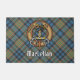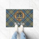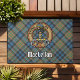 Clan MacLellan crest badge surrounded by a strap and buckle over ancient tartan background. Custom text.