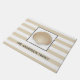 Célula costeira com listras náuticas beges e seu nome familiar em cinzas escuras.