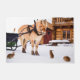 Um cavalo em frente a um trenó pronto para uma carona. Numa fazenda ao ar livre com neve e coelhos correndo livremente no pátio. Um coelho está de pé em dois pés e "falando" com o cavalo. Foto da Noruega, Escandinávia.