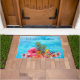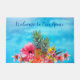 Flores havaianas e abacaxi recebem tapete pela porta da frente. Fundo de água do oceano azul com design tropical e linha de texto personalizado ao longo do topo.