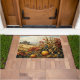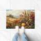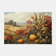 Pumpkins num jardim com caules e flores com uma colina arborizada ao fundo.