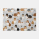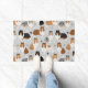 Cães de Collie Rough Cute sentam-se e ficam de pé e rollover com casacos sápidos, tricolores, unidos e brancos com ossos de cão espalhados e padrões de pegadas.