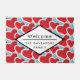 Um tapete amigável de boas-vindas com um padrão repetitivo de 2 corações vermelhos de tamanho diferente, cada coração rodeado por uma borda externa branca. Uma moldura em forma de diamante colocada sobre cima com seu dentro de texto.