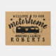Adicione o seu nome de família a esta porta da casa rustica com um fundo falso de burlap e silhuetas pretas, perfeito para RVers. Inclui uma fotografia de uma casa motora com corações e as palavras "Bem-vindo à nossa casa motora", mais duas linhas do seu texto personalizado. Escolha entre dois tamanhos de porta.