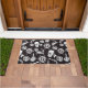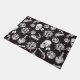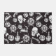 Gráficos brancos de crânios e elementos piratas sobre fundo preto, padrão de repetição contínua