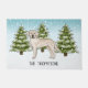 A ilustração original do desenho de Destei de um lindo cão da raça Labrador Retriever. O cão é colocado numa cena de inverno com três árvores de abeto verde e neve caindo. O fundo é um gradiente azul a branco que dá à design aquele olhar frio do dia de inverno. Há também uma área de texto personalizável para um nome.