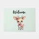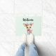 Welcome doormat with an illustration of an adorable baby deer. Big eyes big ears with a large head and little brown antlers. Wearing a big red bow.
