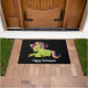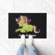 Um feliz tapete de porta do Dia das Bruxas com uma imagem de um unicórnio estilo Frankenstein. Cor roxa e verde. Muito fofo.