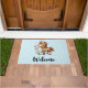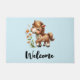 Um tapete de porta desenhado com uma ilustração adorável. Um pequeno pônei marrom comendo margaridas felizes.