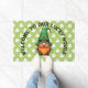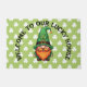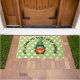 This cute St. Patrick's Day Gnome doormat features a friendly gnome sporting a tall, vibrant green leprechaun hat adorned with a clover shamrock and a classic gold buckleagainst a green background with clovers.