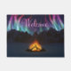 Em um vale coberto de neve em uma noite gelada no morto do inverno uma fogueira salta para cima para espelhar as luzes do norte enchendo o céu acima das montanhas distantes.