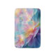 The image features a close-up of abstract floral forms in pastel colors. The petals blend shades of pink, blue, yellow, and purple, creating a soft, dreamlike quality. The centers of the flowers glow with a bright, golden light. Water droplets are scattered across the petals, adding a touch of realism. The background is blurred, enhancing the focus on the delicate floral details.