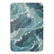 Uma representação digitalmente criada das ondas turbulentas do mar em vários tons de azul e verde com realces brancos simula as cristas geológicas da água. A estilização das ondas dá senso de movimento e a intrincada camada de cores agrega profundidade ao tema aquático.