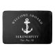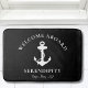 Um tapete de banho preto com tema náutico moderno para o vosso barco que apresenta uma ilustração branca de uma âncora. Você pode personalizar o texto e o monograma "Bem-vindo a Bordo" com o nome e a localização do seu barco na elegante tipografia branca.